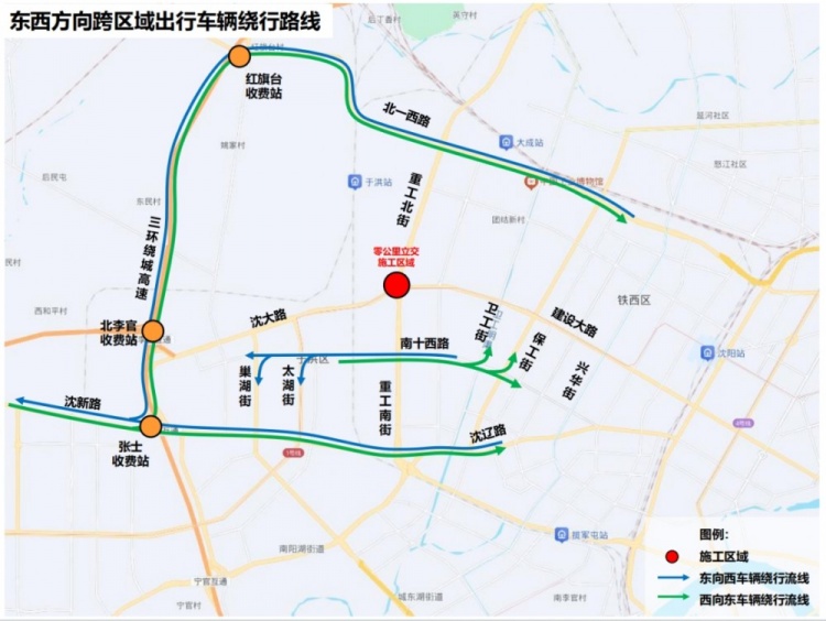 (一)东西方向跨区域出行车辆。原经沈大路—建设大路来往于铁西区、于洪区的长距离出行车辆,请尽量避开零公里立交桥施工路段,提前选择与建设大路—沈大路平行的北一西路、南十西路、沈新路—沈辽路绕行。